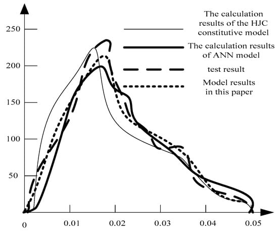 From Figure 11, in the rising stage of stress-strain relationship, the three curves reconstructed by numerical calculation are in good agreement with the experimental curves. However, the results of the HJC constitutive model are different from the experimental results in the initial loading stage. The calculation results of the proposed model and ANN model are basically coincided with the experimental results.