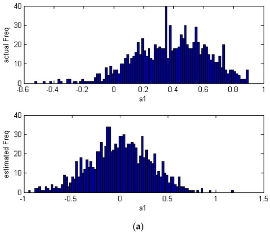 The actual and estimated distribution of (a) and (b) which are non-Gaussian disturbances.