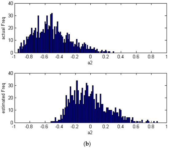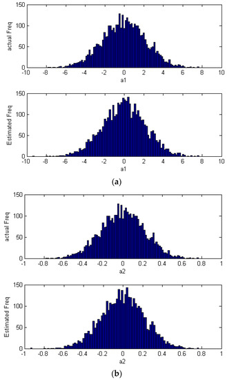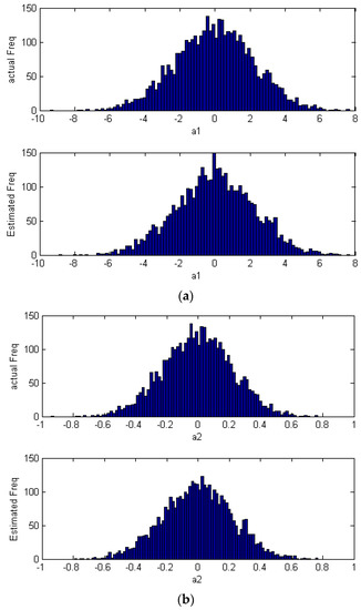 The system structure is shown in Figure 1, for Gaussian noise, make the variances of different disturbances are , respectively. According to the Equation (12), the time delay are . The normal probability of Gaussian disturbance with different variance is shown in Figure 7, and the estimated and actual disturbance distribution plots based on MVC are in Figure 8. Actually, the estimated disturbance variances which using the MVC benchmark are . Obviously, the variances are close to actual disturbance variance.