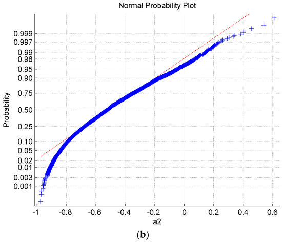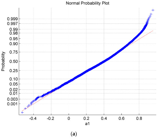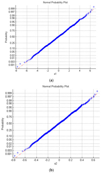 Normal probability plots of the actual disturbance (a) and (b) which are non-Gaussian disturbance.