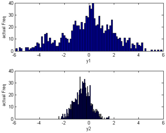 Figure 3 illustrates that the disturbance is subject to non-Gaussian distribution because the plots deviates the straight line. The response with different disturbance of cascade control are shown in Figure 4, and the inner and outer loop output distribution are shown in Figure 5. As can be seen from Figure 4 and Figure 5, the performance of the main output is significantly better than the performance of the secondary loop output , but the MVC indices of the two loops are diametrically opposed, they are and , respectively. According to this example, using the MVC method for a non-Gaussian system may result in erroneous results.