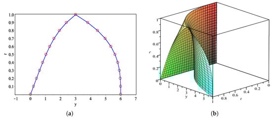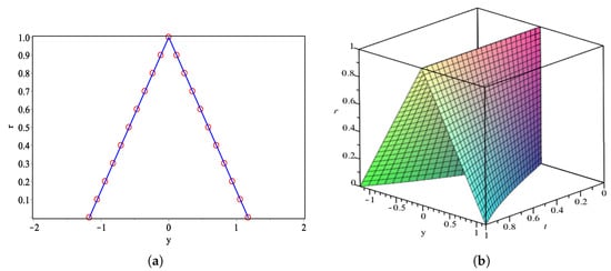 (a) Approximate solution of GLM (circle) and exact solution (line) at ; (b) 3D-plot of GLM for Problem 2.