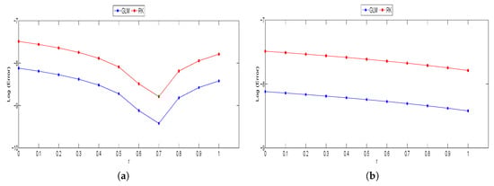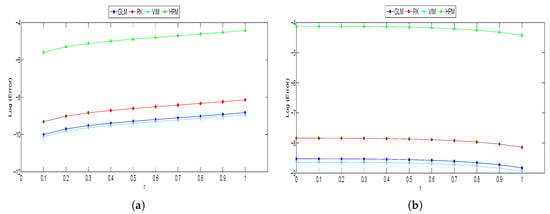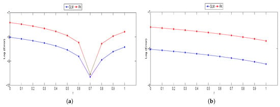(a) Graph of Log (Error) versus r at for left bound of solutions; (b) Graph of Log (Error) versus r at for right bound of solutions for Problem 1.