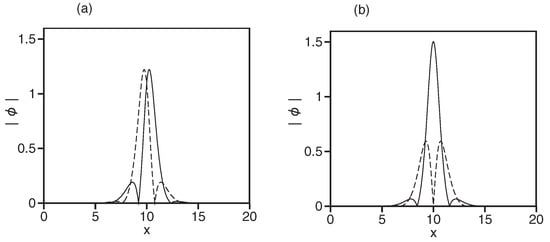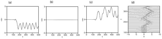 together with the modulation format, . The initial condition is taken as Equation (13) with . The instability manifests itself, in Figure 3b, by oscillations of and with a growing amplitude (the spontaneously emerging oscillatory motion of unstable solitons is illustrated by an example displayed below in Figure 4d). Figure 3b shows the initial stage of the perturbation growth. At larger t, exhibits irregular oscillations with an amplitude around . The situation observed in Figure 3b is a typical picture of mechanical instability caused by the parametric resonance with the frequency ratio 1:2 [], in agreement with relation (16).