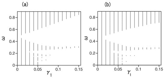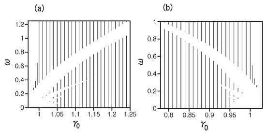 Conspicuous features revealed by Figure 2 are instability troughs created by the management in the originally stable half-planes. These features may be understood as manifestations of resonant interaction of the ac drive, supplied by the management, and an eigenmode of intrinsic oscillations of stable solitons, existing in the absence of the management. To consider this possibility, the MM’s intrinsic eigenmode and respective eigenfrequency were identified by direct real-time simulations of Equation (1), with in Equation (6), adding a small initial perturbation to the numerically exact MM soliton, as follows: