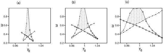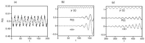 Furthermore, Figure 3c shows the same dynamical characteristics, , and for , , and , which is a point belonging to the second (much more narrow) instability trough in Figure 2a. In this case, the instability is again manifested by the growth of and , although the instability is weaker than in Figure 3b. Comparing the current value of with (see Equation (16)), we conclude that this instability may be interpreted as caused by a direct resonance, with frequency ratio 1:1. A plausible explanation of additional small “notches” in Figure 2a is the presence of very weak higher-order (subharmonic) resonances. Similarly, the instability-trough pattern observed in Figure 2a can be construed as manifestations of the parametric, direct, and subharmonic resonances with an intrinsic mode of the SD soliton.