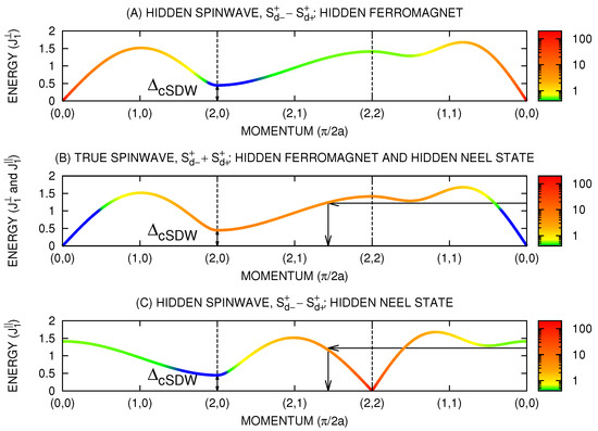 Notice that such hidden magnetic order is equivalent to spin-density-wave order between the and orbitals [21,23]. Application of the particle–hole transformation in Equation (3) yields minus the complex conjugate of Equation (6) plus the replacement . In the presence of off-diagonal frustration, at weak enough Hund coupling, linear spin–wave theory applied to the resulting Heisenberg model in Equation (1) finds such long-range order at [18]. It corresponds to hidden ferromagnetic order [21]: (see the inset to Figure 2A). Figure 1A,B shows the corresponding spin-wave spectra for the hidden ferromagnet at Heisenberg coupling constants , , and , at sub-critical Hund coupling characterized by a spin gap at cSDW wavenumbers. The cSDW spin gap closes at a critical Hund’s Rule coupling constant of in such case [18,19]. Following the particle–hole transformation in Equation (5) of the model parameters, Figure 1B,C shows the spin–wave spectra for Heisenberg coupling constants , , and , but with unchanged. (The critical Hund’s Rule coupling constant is now .) Figure 1C displays a Goldstone mode at wavenumber , which is evidence for a hidden Néel state. This hidden antiferromagnet shows opposing Néel order per orbital (see the inset to Figure 2B and Ref. [22]), which is consistent with the particle–hole transformation in Equation (4) of the hidden ferromagnet. Notice that the spectrum of hidden spin–waves (Figure 1C) is obtained by shifting the spectrum of its particle–hole conjugate (Figure 1A) by the wavenumber [18].