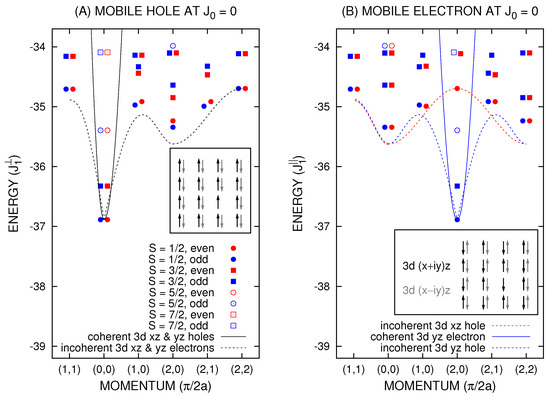 Exact spectra for t-J model (Equation (1)), over a periodic lattice, with hopping parameters (A) , , , , and in the mobile-hole case (31 electrons). Model parameters transform to (B) , , , , and in the mobile-electron case (33 electrons). Heisenberg exchange coupling constants are given in the caption to Figure 1. Even/odd quantum number refers to parity under .