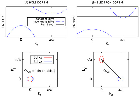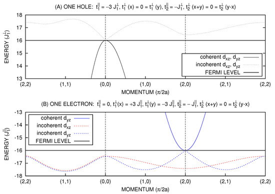 We now compare spectra for one mobile hole and for one mobile electron with respect to half filling, with t-J model parameters that are related to each other by the previous particle–hole transformation in Equation (5). In the hole-doped case, the Heisenberg exchange coupling constants coincide with the previous set for the hidden ferromagnet (Figure 1A), while the hopping matrix elements are set to , , , and . The latter implies that the (even) versus the (odd) orbital is a good quantum number. In the electron-doped case, nearest neighbor t-J model parameters are set by Equation (5), while on-site and next-nearest neighbor model parameters are unchanged. Figure 2 shows exact spectra for one mobile hole and for one mobile electron roaming over a periodic lattice of iron atoms, in the absence of Hund’s Rule, . The Schwinger-boson-slave-fermion representation of the correlated electron (hole) in the limit was exploited in such case [31,32]. Details of the numerical calculation are given in the Supplementary Materials and in Ref. [20]. Notice that all of the states obey the particle–hole transformation in Equation (3). Figure 4 shows the one-electron spectra predicted by Schwinger-boson-slave-fermion mean field theory, but at for hole doping, and at for electron doping. Notice that the states again obey the particle–hole relationship in Equation (3) depicted by Figure 3.