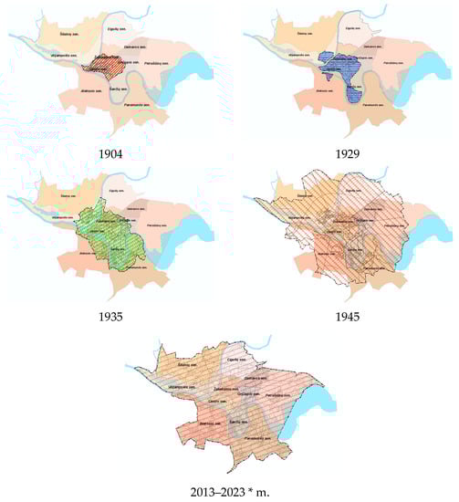 Figure 1 shows that the urban area covered the entire present Centre neighbourhood and a part of Zaliakalnis and Griciupis neighbourhoods in 1904. A part of the current neighbourhoods of Sanciai, Vilijampole, and Aleksotas joined the area in 1929, a part of Griciupis and Panemune neighbourhoods—in 1935. In 1945, the area of Kaunas was partially formed by all present neighbourhoods of the city.