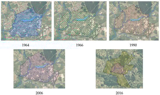 Within the examined period from 1964 to 2016, Silale town developed evenly in all directions, along with variations in the number of the population that fluctuated and faced both an increase and a decrease. For the period from 1989 to 2016, a drop in the population was noticed, which might be affected by tendencies in the aging population, a low birth rate, and the structure of economy, i.e., a reduction in the structural part of agricultural production, migration to metropolitan areas, and foreign countries. The opposite trend is evident when looking at variations in the space of the urban area. From 1964 to 2006, the area of Silale town gradually increased. From 2006, according to the general plan of the town until 2016, the long-term urban area increased to 17.95 km2 following a decision regarding the connection of surrounding villages to the city (Figure 3). During the period considered, the town formed and became compact, including the surrounding residential areas. Thus, it can be proposed that the urban area was evenly subject to population growth prior to 2006.