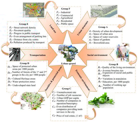Cities are constantly expanding externally, regardless of the ever-decreasing population. The analysis of territorial variations in Kaunas city, as well as in Taurage and Silale towns, has showed that, according to the latest general plans of Silale and Taurage, the outer development of these cities is scheduled, although the areas still have room to expand inside. There is a risk, because this option allows for the expansion of urban areas and carrying out construction works in the large area, thus providing perfect conditions for settling small groups of urban areas that are situated around the densely developed towns of Taurage and Silale. These examples show that, in order to manage urban and outer development, the main criteria in inner development must be analyzed, so that the towns could seize all the inside opportunities for expansion. Figure 4 presents a scheme for the formulated and selected key groups of criteria in urban development. The criteria affecting inner urban development have been formulated and divided into six groups: Group A—Urban Structure (five criteria), Group B—Social Environment (six criteria), Group C—Economic Environment (six criteria), Group D—Sensitive and Protected Areas (five criteria), Group E—Transportation (six criteria), and Group F—Land Use (five criteria).