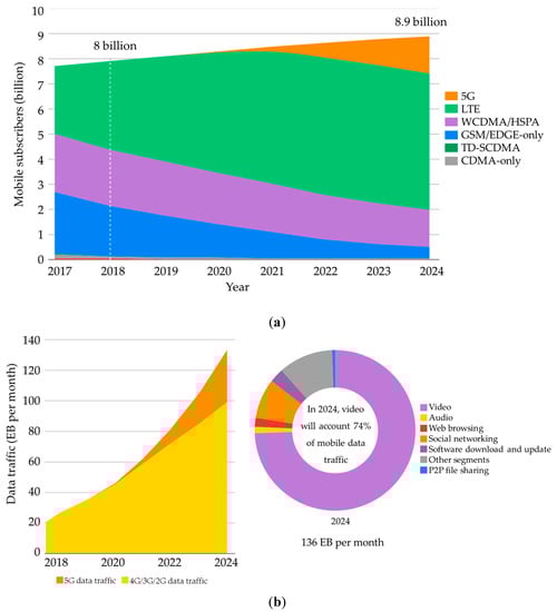 Cellular networks are one of the most important technological innovations witnessed in recent times, improving the quality of human life and contributing to economic growth. Recently, cellular networks have developed tremendously to offer video streaming data, which explains the rapid growth in mobile subscribers []. Mobile subscriptions grew approximately 3% between 2017 and 2018 to reach 7.9 billion in Q3 2018, while mobile data traffic grew by approximately 79% in the same period to reach approximately 20.7 ExaBytes (EB) per month in Q3 2018 []. Moreover, the number of mobile subscribers will increase exponentially due to continuous development of cellular networks, the advent of the fifth generation (5G) of cellular networks, and the Internet of Things (IoT), which is considered the backbone of emerging applications, moving the telecommunications forward to contribute to quality of life and grow the world’s economy []. By 2024, mobile subscriptions are expected to reach 8.9 billion; meanwhile, cellular IoT connections will reach 4.1 billion, with mobile data traffic using approximately up to 136 EB per month, wherein 74% will be utilized for mobile video traffic, and 5G networks will carry 25% of global mobile data traffic []. Figure 1 presents the growth of global mobile subscribers and mobile data traffic based on cellular generations.