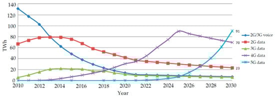 - According to [], the world’s yearly electricity usage for the telecommunications sector is increasing and expected to reach 51% of global electricity in 2030 unless the electricity efficiency of wireless access networks and access/data center networks is sufficiently improved. CNs are considered the cardinal contributor to the appreciable rise in energy utilization in the telecommunication sector []. Figure 2 shows the expected global electricity usage of cellular networks based on different cellular generations to 2030. BSs are the major consumer of energy in CNs and account for 57% of the total energy consumed []. The number of BSs worldwide is increasing, which led OPEX to rise conspicuously because a greater percentage of the OPEX entails electricity bills [].