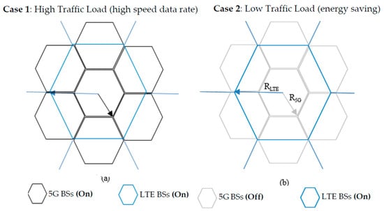 Mobile users’ demand can be summarized as a high data rate with QoS and full radio frequency coverage. Hence, in order to meet subscribers’ QoS expectations, all BSs inclusive of LTE and 5G are required to be active and functional. This will lead to the provisioning of optimal network performance meeting mobile subscribers’ expectations. Priority should be given to 5G cells because of the small cells involved. 5G BSs should perform traffic monitoring periodically, along with data delivery. This will enable the 5G BSs to switch off in case the mobile wireless traffic load decreases under a certain threshold, λ ≤ 0.4, and remains under the threshold for a certain period. This denotes the low mobile wireless traffic use case (energy-saving case). However, LTE BSs are active in a high traffic case to assist 5G BSs with the provisioning of extra coverage to subscribers.