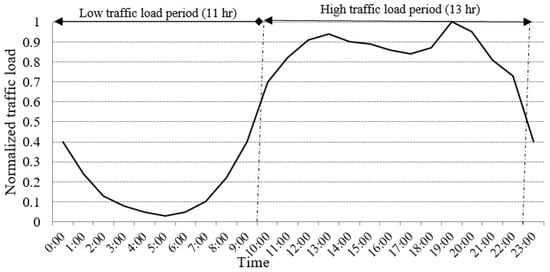 Basically, the idea behind the proposed algorithm is to exploit the coexistence between LTE and 5G and achieve an equilibrium between network performance and EE through a dynamic BS switching off/on approach based to the traffic demand conditions. Figure 4 depicts a real-world wireless CN traffic profile, as reported in []. The traffic profile during the day is higher than that of the night. The high traffic load ranges between 0.4 and 1, and occurs between 10 a.m. and 11 p.m. (13 h). The low traffic load ranges between 0 and 0.4, and occurs between 11 p.m. and 10 a.m. (11 h).