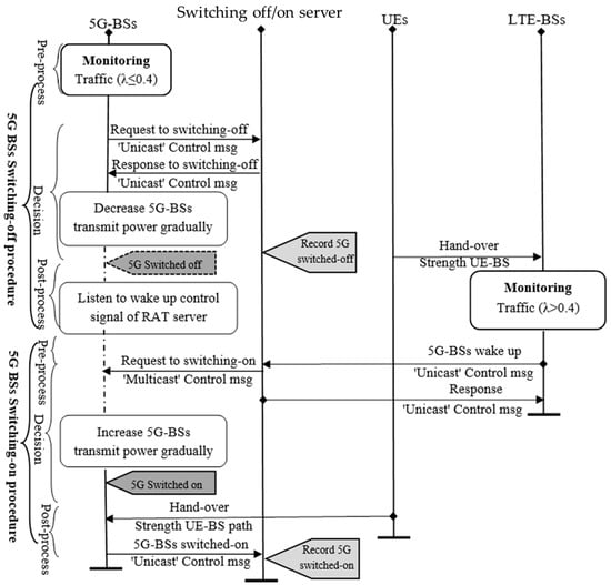 - Post-processing Status:The 5G BSs that are switched off listen for the wake-up control signal from the switching off/on server.. Meanwhile, the active LTE BSs are in full functionality and are capable of supplying subscribers’ QoS requirements. In addition, LTE BSs are mandated to monitor traffic across the network based on LTE BSs’ information, which is based on the decision to keep the 5G BSs off or start switching them on if the traffic increases to more than 0.4.