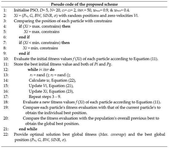 PSO is preferred because of its capability to maximize the cell coverage area when studied under the Ptx, BW, G, SINR, and σ constraints. Moreover, the MCS, data rate, and EE were taken into consideration. The PSO approach are equipped with the following attributes: flexibility, adaptability to the problems, strong global search ability, and robust performance. PSO performance is comparable to that of genetic algorithms or the ant colony algorithm because it is faster and less complicated. PSO has also been successfully applied to a wide variety of problems. Moreover, PSO is simple to implement and is a very efficient global optimizer for continuous variable problems. See [,,,] for applications in which PSO has been successfully applied to the field of wireless communication networks.