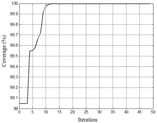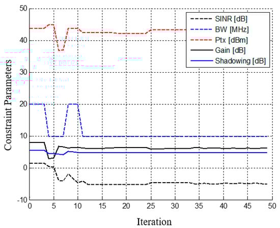 Figure 7 shows that at the start, with random particle positions and zero velocities (at iterations equal to zero), the LTE cell coverage area was 99.05%, with Ptx = 43.08 dBm and G = 7.97 dB, at SINR = 1.49 dB and σ = 5.50 dB, as shown in Figure 6. From Figure 6, when the SINR decreased, both Ptx and G increased to maintain the maximum coverage area. The simulation results demonstrated that the optimum transmitting power Ptx and the antenna gain G that maintain maximum coverage at the edge (where the SINR was the lowest at −5.1 dB and where the shadowing is at 4.8 dB) are 43.1 dBm and 6.3 dB, respectively. In addition, the optimal BW is 10 MHz during the period that the 5G BSs are switched off; the optimal BW is proportional to Pmin, as given in Equation (11). However, for a high data rate, a BW greater than 10 MHz can be used. In this case, the full coverage is not secure because the Pmin required is high. It is plausible that big bandwidth has the possibility of improving the EE when compared to a small bandwidth within the same size coverage area based on the premise that big bandwidth can support more resource blocks, eventually leading to a higher data rate.