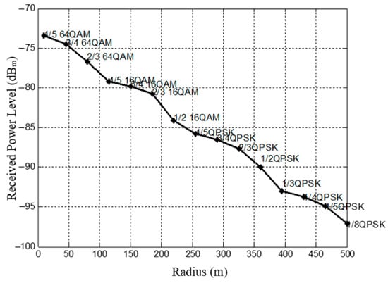 For the downlink (DL), i.e., from the BS to the UE, the BS typically selects the MCS based on the channel quality indicator (CQI) feedback characteristics of the UE receiver, i.e., the SINR via an adaptive link strategy. Based on assumptions made in [], Figure 9 shows the relationship between the radius of the cell, Pmin, and the MCS. The received power level is obtained from the sensitivity calculation in Equation (9), and the values of SINR, IM, etc., are retrieved from Table 1.