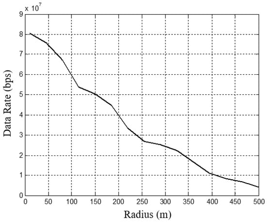Data rate versus macrocell radii, with Ptx = 43.1 dBm, BW = 10 MHz, and 2 × 2 MIMO.