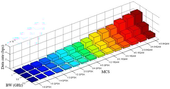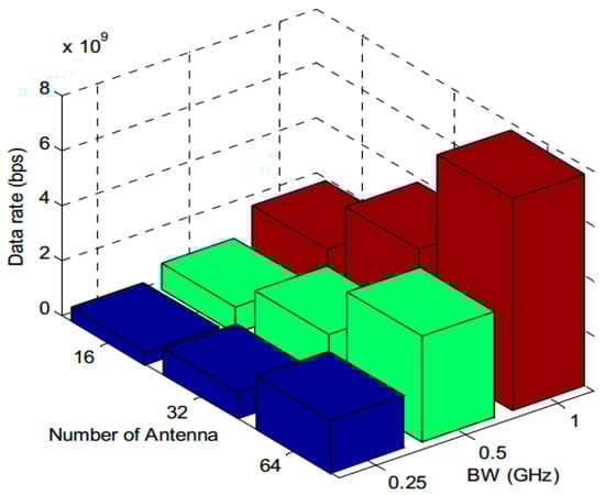 For a 5G mm-wave small cell with a 500 MHz BW, 694 RBs are available. LTE technology comprises a RB having 12 subcarriers with 60 kHz subcarrier space. Then, each of the subcarrier has seven symbols for normal CP and six symbols for extended CP. Both the normal and extended CP have a slot time of 0.1 ms []. Mathematically, it is possible to estimate the number of symbols per RB as 12 × 7 × 10 = 840 symbols per ms, corresponding to 582,960 symbols per ms. On the other hand, if 1/8 QPSK is deployed for edge users (2 bits per symbol with a coding rate of 1/8), the data rate is 0.146 Gbps for a single chain. Therefore, with eight antenna sectors, the data rate is 8 times that of a single chain, for a total of 1.167 Gbps. In addition, with a high-order modulation 64QAM, the total data rate with 500 MHz BW and eight antennas is up to 22.4 Gbps. Figure 11 summarizes the data rate versus MCS and BW for eight antennas. Moreover, Figure 12 summarizes the data rate that can be achieved with various numbers of antennas for different BWs at the edge of 5G small cells.