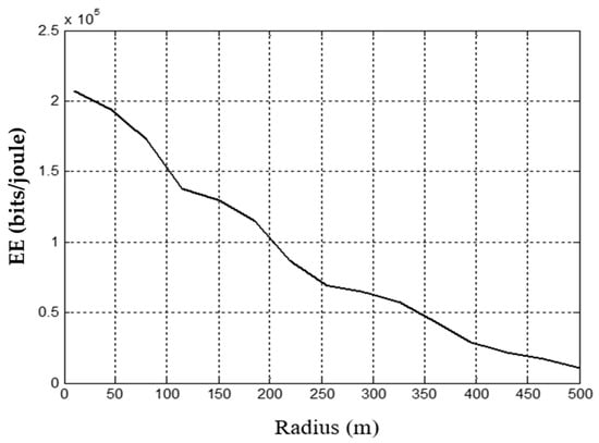 Hence, in a high-traffic case, both the LTE and 5G cells are active and serve the users in the network. However, the priority goes to the 5G small cells that can provide the minimum data rate at the edge of the 5G cell of 1.167 Gbps at 1/8 QPSK with BW = 500 MHz and eight antennas used, as shown in Figure 9. By contrast, for the low-traffic case (energy saving case), the 5G BSs are switched off, and coverage is guaranteed by the LTE BSs; the maximum data rate at the edge of the LTE cell is 4.2 Mbps (R = 500 m) at 1/8 QPSK with BW = 10 MHz and two antennas used, as shown in Figure 8. However, the 4.2 Mbps data rate during the low traffic case (11 PM to 10 AM) is acceptable because the number of subscribers that are using the network for downloading data is so low during that time. Meanwhile, the voice calls are secured with full coverage by the LTE BSs. Figure 13 shows the EE performance for LTE BSs versus the cell radii.