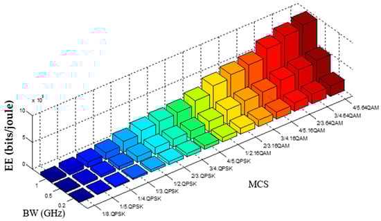 From Figure 13, the EE at the edge of the LTE cell is 7.19 kb/j, which was computed based on Equation (18), i.e., a data rate of 4.2 Mbps at 1/8 QPSK with BW of 10 MHz and two antennas used, divided by the total power consumption of the 584.12 W.