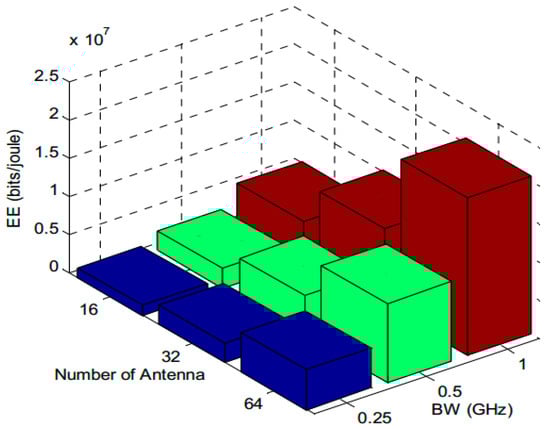 For a 5G small cell, the EE at 1/8 QPSK with BW 500 MHz and eight antennas used is 25.06 Mb/j, as shown in Figure 14, where the data rate of 1.167 Gbps is divided by the total power consumption of 46.57 W. Moreover, Figure 15 shows EE versus the number of antennas for the different BWs at the edge of the 5G small cell.