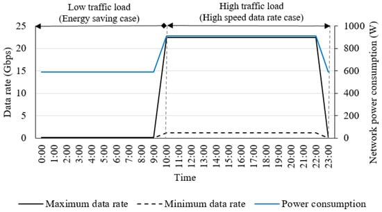 Finally, the energy savings achieved by the proposed method is briefly discussed. The simulation layout involved seven 5G BSs and covered a smaller area than the LTE BS (as shown in Figure 3). The 5G BSs are active for only 13 h (10 a.m. to 11 p.m.) during peak time (as shown in Figure 2) and are in sleep mode at other times. The LTE BSs are active all the time; during high-traffic periods, they ensure the coverage and support of the 5G BSs, whereas during low-traffic periods, LTE BSs have two functions, data delivery and ensuring maximum coverage and radio service.