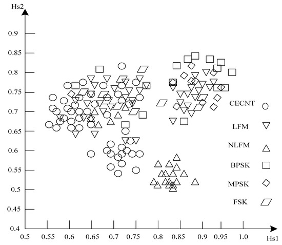 From Table 1, it can be seen that in the SNR range of 5 to 20 dB, the average correct extraction rate of different types of network transmission signal features obtained by the proposed method is satisfactory, which shows the effectiveness of the proposed method in identifying the transmission signal of electronic communication network. The average correct extraction rate of the proposed method is higher when is not equal to 2 than when is equal to 2. That is to say, the average correct extraction rate of the proposed method is higher in the process of extracting transmission signals, and the maximum can be increased by more than 5%. The average correct extraction rate is the best when is equal to 4, and the average correct extraction rate reaches 98.21%. For different forms of transmission signal in electronic communication network, appropriate adjustment of value can obtain a better average correct extraction rate. In order to further illustrate the good characteristics of the proposed method, 1800 training sets of six kinds of transmission signals in electronic communication network at p = 5 are selected to draw a two-dimensional joint feature distribution map as shown in Figure 3.