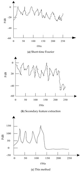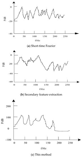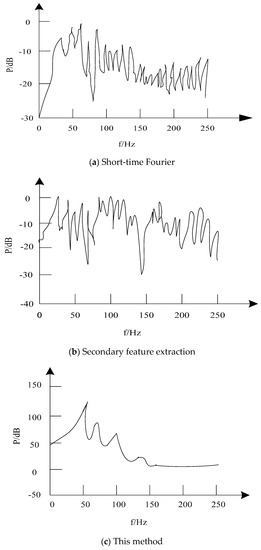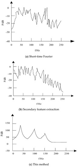 In order to verify the practical application effect of feature extraction of transmission signal in an electronic communication network based on the proposed method, a simulation application example of extracting harmonic frequency features of transmission signal in electronic communication network is given. The transmission signal of the electronic communication network is sampled by the computer at the frequency of 44,100 Hz. Because the sampling frequency is 1024 Hz, according to the sampling theorem, the analysis frequency is 512 Hz. Because the features of the transmission signal in the electronic communication network are mainly concentrated below 300 Hz, the frequency range of the proposed method is 0–250 Hz and the step length is ∆f = 0.5 Hz. The white noise interference signal with high intensity of 52,626 Hz is input into the experimental signal to simulate strong vibration, to verify the performance of the proposed method for the extraction of communication signal features in strong vibration environment. The experiment compares the proposed method with the short-time Fourier method and the quadratic feature extraction method. The extraction results of the signal frequency characteristics are described using Figure 7, Figure 8, Figure 9 and Figure 10 respectively.