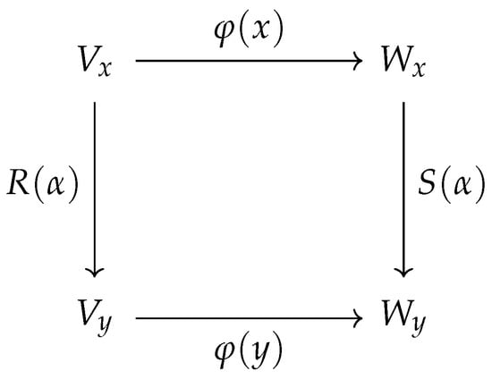 There is a ‘natural’ notion of equivalence between linear representations of a groupoid and it is given by the notion of natural transformations among functors. More specifically, a natural transformation between the functors R and S defining two linear representations of , assigns to any object x of the groupoid a linear map such that the diagram below (Figure 2) is commutative, that is, for any .