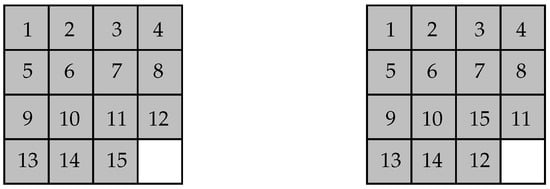 In principle we could denote each move as where k is the initial state and j is the final one. There are also the trivial moves that do not change the state (that is, no exchange at all), which will be denoted respectively by . However, it is clear that there are other elements in the groupoid which do not change the state (in the sense that the empty box is still in its place) but the pieces around it have been exchanged. For instance, if the original state is , consider the sequence of moves (taking into account the numbered boxes) , where the pair means that the move takes the box in position j (in the original configuration of boxes) to position i, that is, the move will move the box sitting in position 15 down to occupy position 16, and so on. This would imply that the state is transformed in the state as the empty box changes from position i to j. Then the source of the move would be i and target j. We could denote the composition of the sequence of moves as (where the circle ∘ will stand for the composition rule of the groupoid that consists in performing one move after the other). The final state would be again, but the pieces have been moved around (we have changed the configuration of the square, see Figure 3, right, displaying the final configuration). Notice the explicit consistency condition on the composition of moves and that the source and target of the composition is the same state ( in this example). In what follows we will just denote the states by the numerals i (reducing risk of confusion).