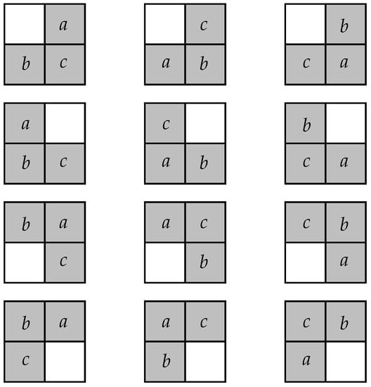 A explained before, a state is defined by the position of the empty box. There are four states . Each state has different configurations, depending on the positions of the letters . Take for instance the state , which has three configurations, (see the first row in Figure 4). The isotropy group is isomorphic to the alternating group in three elements, , which in this case is Abelian and can be written as: