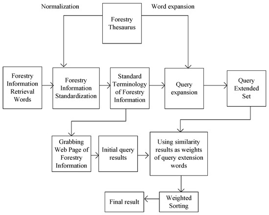 Firstly, the retrieval terms of forestry information features input by users are extracted, and the standardization of them is judged according to the thesaurus of forestry information features [19,20,21]. Due to the different user’s retrieval needs and input habits, there may be four different situations: If the forestry information feature retrieval words are thesauri, they need not be standardized and can be used directly; if the forestry information feature retrieval words are non-thesauri in thesaurus, they can be transformed into corresponding thesauri through the equivalent relationship of thesaurus; if the forestry information feature retrieval words can match the part of the thesaurus, all the matchable thesauri will be returned for users to select new forestry information feature retrieval words from them; in other cases, the original feature search words are retained without query expansion.