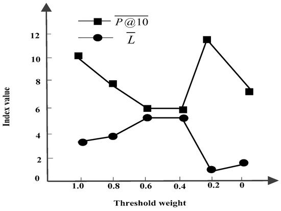 Figure 3 shows that when the threshold value is 0.2, the data value of is the highest, that is, the correlation degree of the first 10 results is the highest; is the lowest, that is, the least irrelevant results need to be browsed to find the first 10 related results. Therefore, the threshold determination is 0.2.