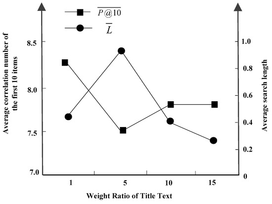 Two important parameters were determined by experiments: Threshold Q used in forestry information feature query expansion module and heading text ratio in weighted ranking. In order to determine the characteristic weights of forestry information as accurately as possible, 10 forestry terms were randomly selected from the experimental data for testing. In the experiment, the first 100 search results of Baidu search engine are selected as the results of the general search engine to grab the forestry information web pages, and the title text of the forestry information feature retrieval is set to 1 first. Relevant forestry personnel confirm whether the returned results are related to the search terms. Use the final result to draw a broken line, as shown in Figure 3. In Figure 3, represents the average correlation of forestry information features of the first 10 items, and represents the average search length of forestry information features.