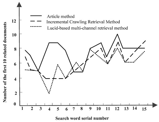 Comparison of retrieval results of three systems based on the number of the first 10 related documents.