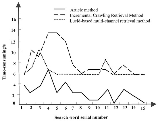 In order to further verify the performance of the proposed method, the retrieval time of the three methods is compared and analyzed. The results are shown in Figure 7.