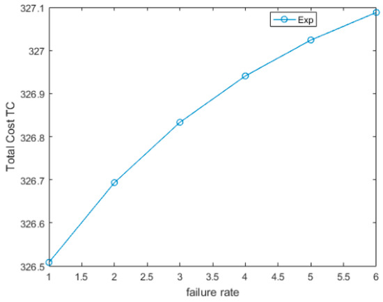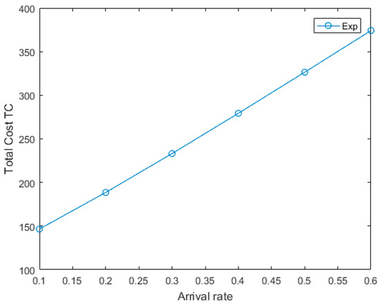 where are given in Equations (52) and (61), respectively. Our objective is to find the total expected cost per unit of time (TC) by fixing the cost and other parameters. The effect of decision variable behaviors is presented in Figure 2. For the following values of the cost elements and other parameters such as λ = 0.5; δ = 2; α = 0.5; μb = 5; μp = 3; μw = 2; γ = 3; θ = 2; Ch = $5, Co = $60, Cs = $500 and Ca = $90 are chosen according to the satisfaction of the stability condition. Then the total expected cost per unit of time is TC = $310.3895.
