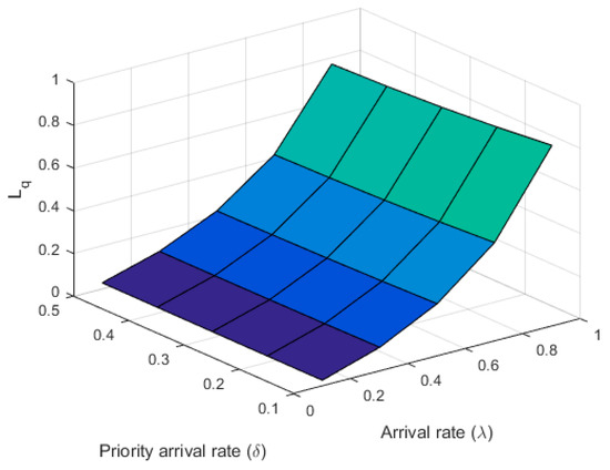 The sensitivity of parameters with respect to different performance indices are explained graphically in Figure 3, Figure 4, Figure 5 and Figure 6. In Figure 3, the surface displays an upward trend as expected for the increasing value of arrival rate of ordinary (λ) and priority (δ) customers against the mean orbit size (Lq).
