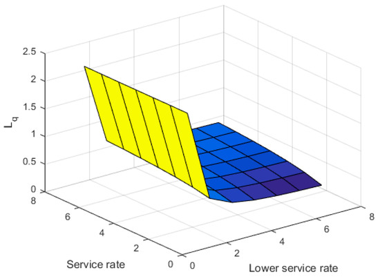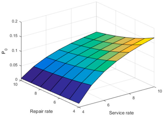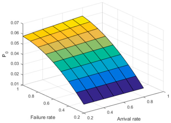 It is found from Figure 4 that P0 decreases with the increasing values of failure rate (α) and ordinary arrival rate (λ). As expected from Figure 5, the mean orbit size (Lq) decreases with the increasing value of the lower service rate (μw) and regular service rate (μ). Figure 6 shows that the idle probability increases with the increasing values of service rate (μ) and repair rate (η).