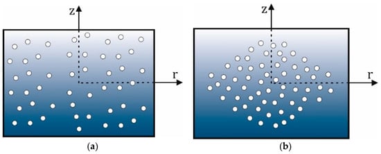 Consider a porous FGM thin circular plate with radius and thickness presented in the cylindrical coordinate with the z-axis along the longitudinal direction. The geometry and the coordinate system of the considered circular plate are shown in Figure 1. The FGM plate contains evenly (e) and unevenly (u) distributed porosities along the plate’s thickness direction. The cross-sections of the FGM circular plates with the two various types of distribution of porosities are shown in Figure 2.