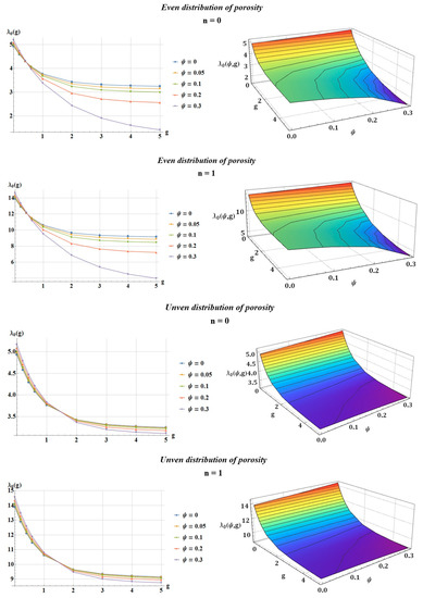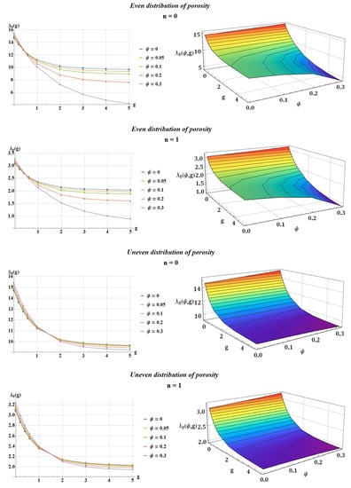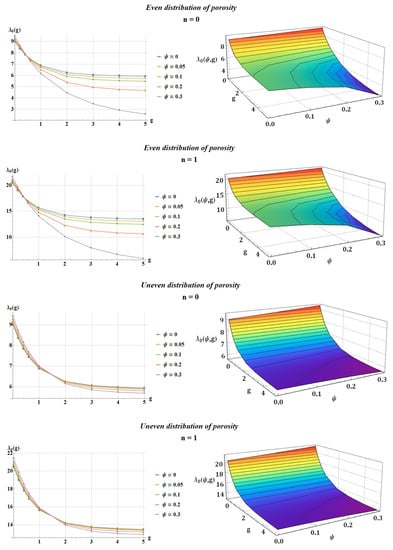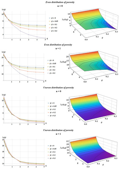 - for the unevenly distributed porosities, the fundamental eigenfrequency of the axisymmetric and non-axisymmetric vibrations of the plate increases with the increasing value of the porosity volume fraction for and decreases for ;