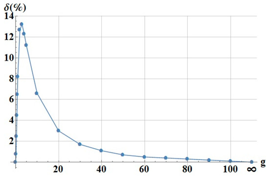 where and are the fundamental dimensionless frequencies of the perfect FGM circular plate without and with effect of the coupling in-plane and transverse displacements, respectively. Figure 7 presents the dependence of the differences (errors) between obtained results for the power-law index .
