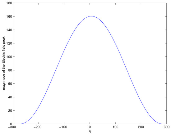 Magnitude of the electric field peak vs. . Parameters are the same with Figure 1.