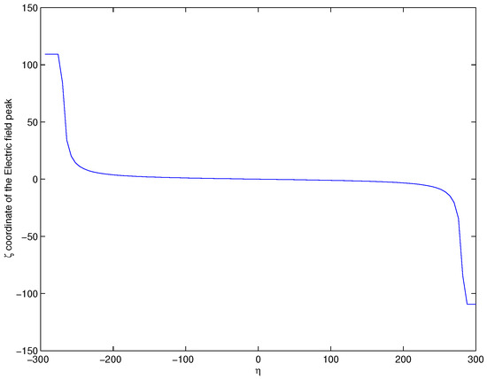 Position of the electric field peak vs. . Parameters are the same with Figure 1.
