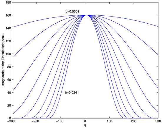 Magnitude of the electric field peak vs. for various values of b, from b = 0.001 to b = 0.0241 with steps b = 0.003. All other parameters are the same with Figure 1.