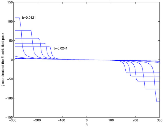 Position of the peak of electric field vs. for various values of b, from b = 0.001 to b = 0.0241 with steps b = 0.003. All other parameters are the same with Figure 1.